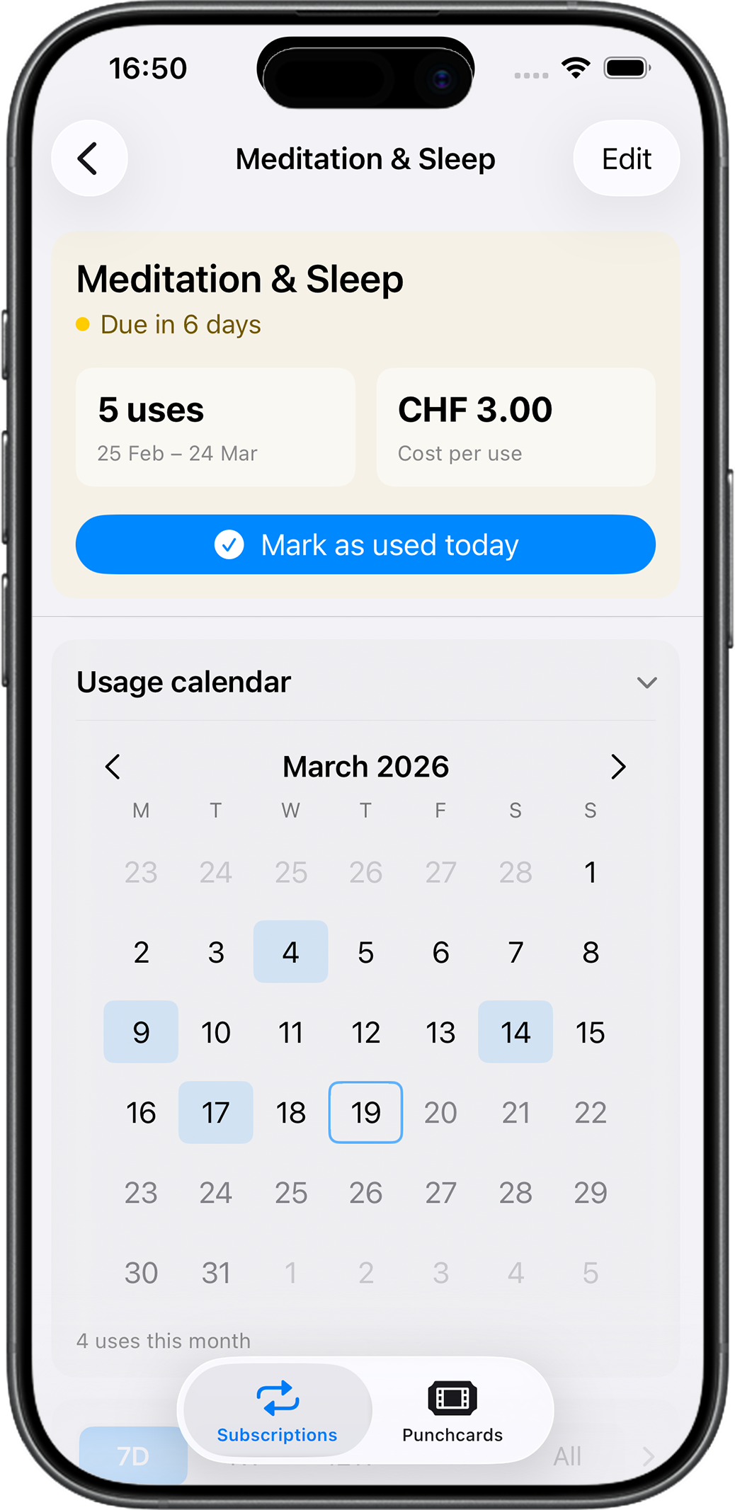 Trakabo is an iOS app designed to help you track subscriptions and punchcards in one simple place. Instead of focusing only on prices and renewal dates, it lets you record real usage — every visit, session, or redeemed credit. By showing how often you actually use what you pay for, the app helps you understand its true value and make clearer decisions when renewal time comes.